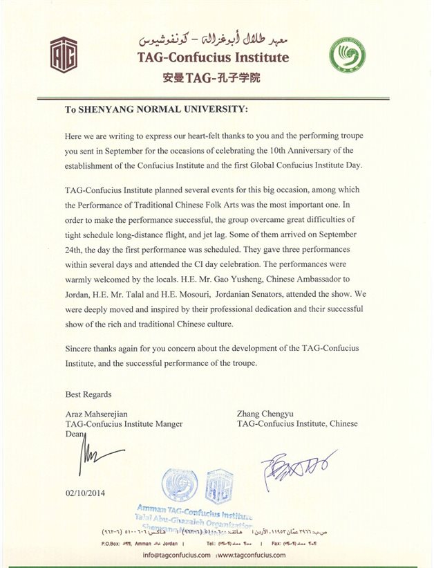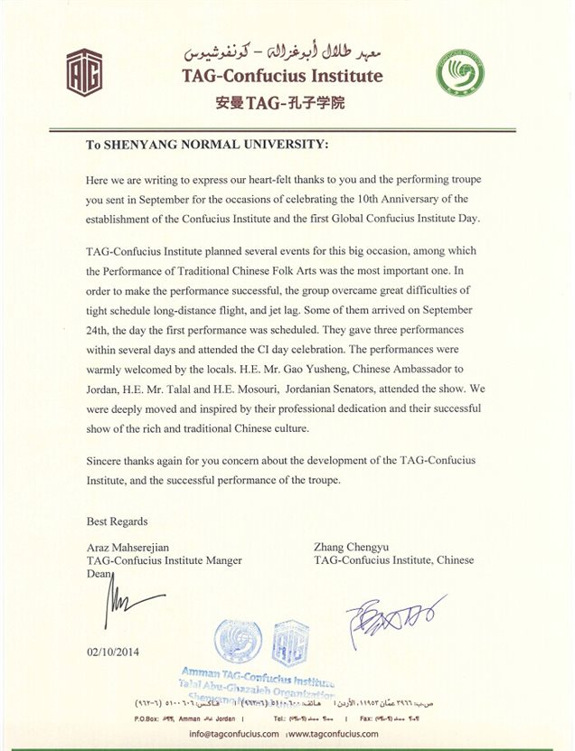 此次艺术团巡演得到了国家汉办、中国驻约旦大使馆及约旦TAG孔子公司的一致好评和肯定,并得到了新华网等主流媒体的报道,约旦安曼TAG集团孔子公司还专门对艺术团的巡演发来了感谢信。