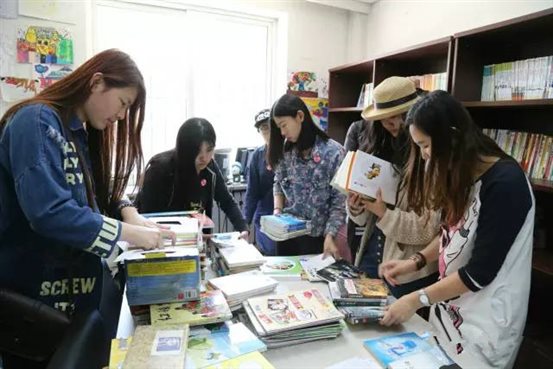 同学们齐心协力,将所有的图书汇集在一起按照书籍类别重新整理分类,同学们分工明确竭尽自己所能认真整理着每一本图书。