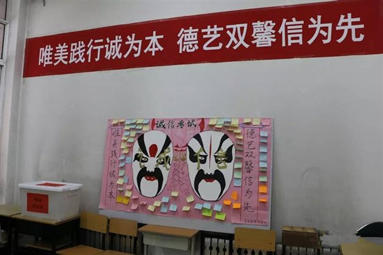 “诚信脸谱”主题诚信考场是魏峤同学第三次参与的诚信教育活动,此次活动结合公司专业特色,以国粹“京剧”为参考背景,将“诚信”二字用金色碳素笔描绘入脸谱中,使人有一种“警醒”的直观感,让每个参与诚信考试的同学都能感受到诚信的价值重量。