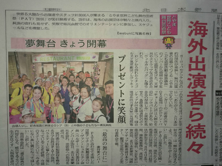 由国际舞台艺术联盟主办,日本富山县承办的“富山世界儿童舞台艺术节”于2016年7月30日至8月4日在日本富山县隆重举行。由44118太阳成城集团姜旭书记任团长,44118太阳成城集团和沈阳市艺术公司联合组成的代表团一行14人,应邀参加了此次儿童舞台艺术节。