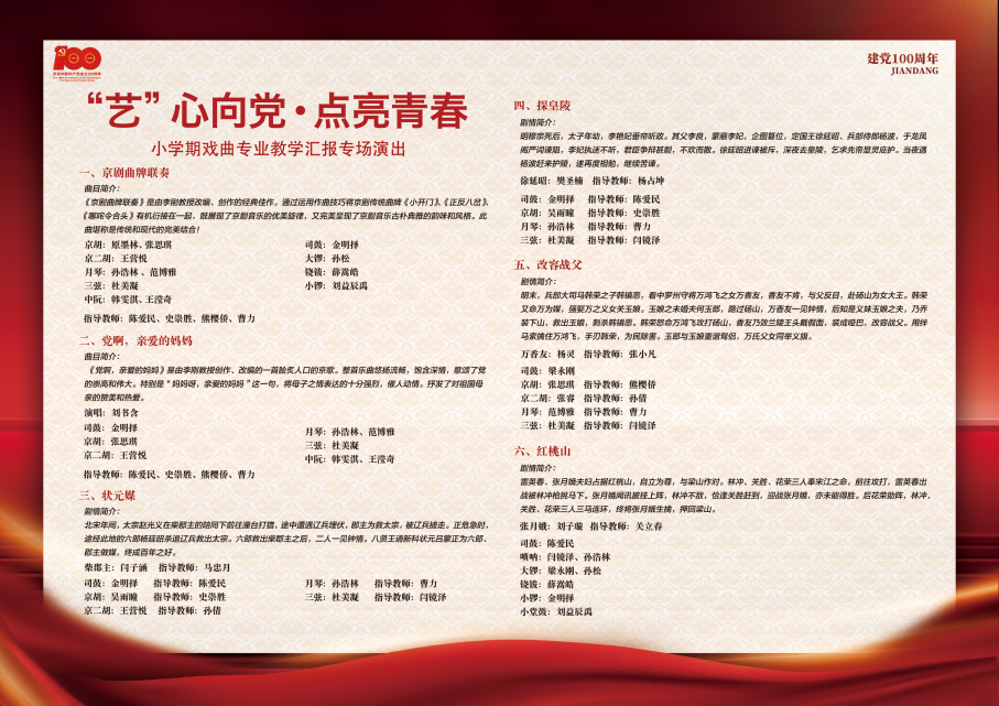 2021年7月1日,在这个举国欢庆的伟大节日中,公司京剧表演专业师生为建党百年献上了属于他们的礼赞,举办了《“艺”心向党,点亮青春》小学期教学汇报专场演出。演出于下午1:30分准时拉开帷幕,校督学、公司领导班子、各系主任、副主任、公司师生代表共同观看演出并给予一致好评。