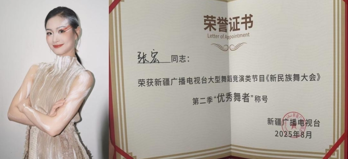 《新民族舞大会》第二季是新疆广播电视台、新疆舞蹈家协会共同打造的高水平舞蹈展演平台。第二季以“丝路风华”为主题,突破传统舞台局限,走进天山托木尔景区等地实景录制,深度融合文旅与艺术,打造具有国际视野的舞蹈盛宴。节目组在全国乃至国际范围内遴选优秀舞者近千余人,历经多轮专业考核,最终56位舞者脱颖而出,张宏同学凭借其扎实的功底与独特的艺术感染力,成功跻身其中,并获得“优秀舞者”称号。