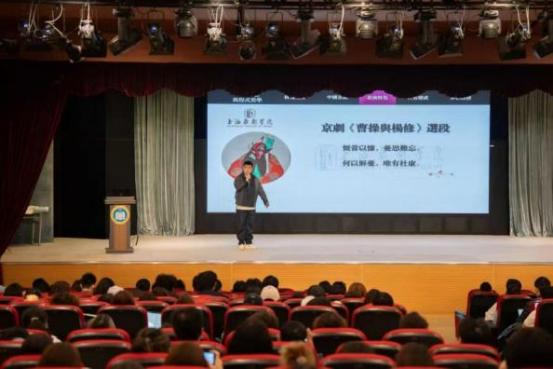 讲座伊始,苗瑞珉老师从东方神韵与程式美学切入,系统阐释了戏曲的基本概念。他指出,京剧作为中华优秀传统文化杰出代表。以“歌舞演故事”为核心,融文学、音乐、舞蹈、美术、武术、表演等多种艺术形式于一体,具有独特的综合性、程式性与虚拟性。为让观众更直观地感受京剧的艺术魅力,苗老师现场演绎了经典剧目《曹操与杨修》选段,生动呈现花脸行当笑貌与怒态的程式,赢得热烈掌声。