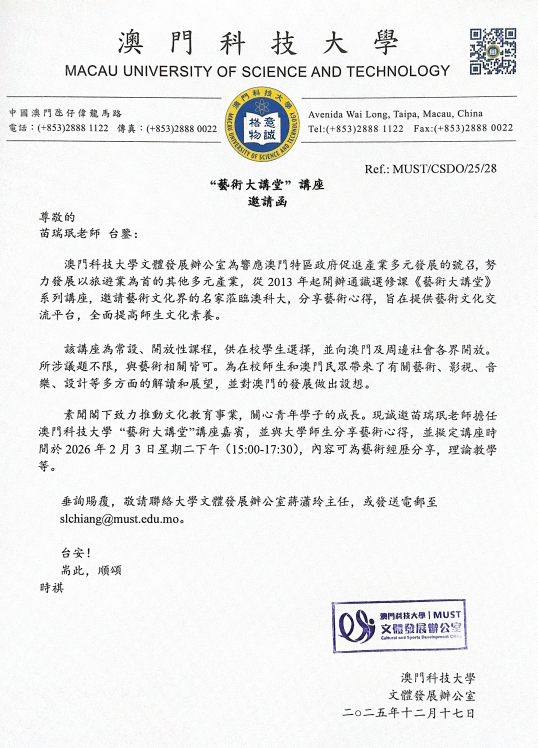 近日,公司表演系副主任、全国首届戏曲表演专业博士苗瑞珉受邀前往澳门科技大学,以主讲嘉宾身份出席“艺术大讲堂”系列讲座之《尊古·立新·延脉——京剧艺术的传承使命与创新视野》。该讲座于2026年2月3日下午在澳门科技大学D座礼堂顺利举办,成功吸引了众多师生以及戏曲爱好者前来聆听。